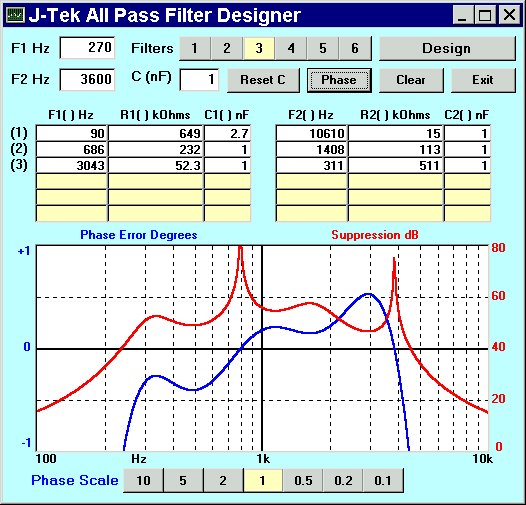In this design the values that have been entered are those used in the R2/T2 design by KK7B. Three All Pass filters have been used in each path. Over the frequency range from 300 Hz to 3 kHz it can be seen that the opposite sideband suppression should exceed 45 dB and is over 50 dB in the middle of the range. There is quite a slope on the phase response curve that shows that changing some values could improve the performance still further. Presumably practical compromise values were chosen.